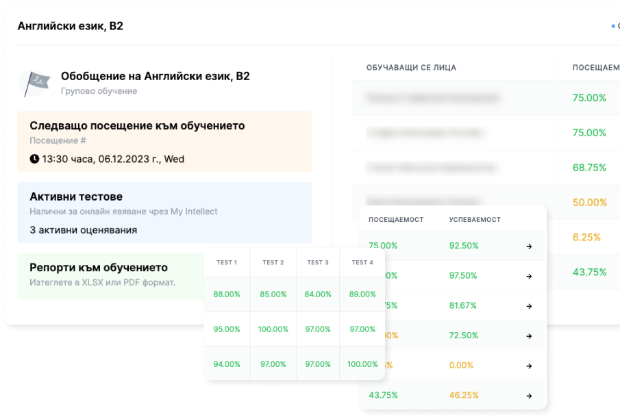 - Отчетност на резултатите на обучаемите в реално време;